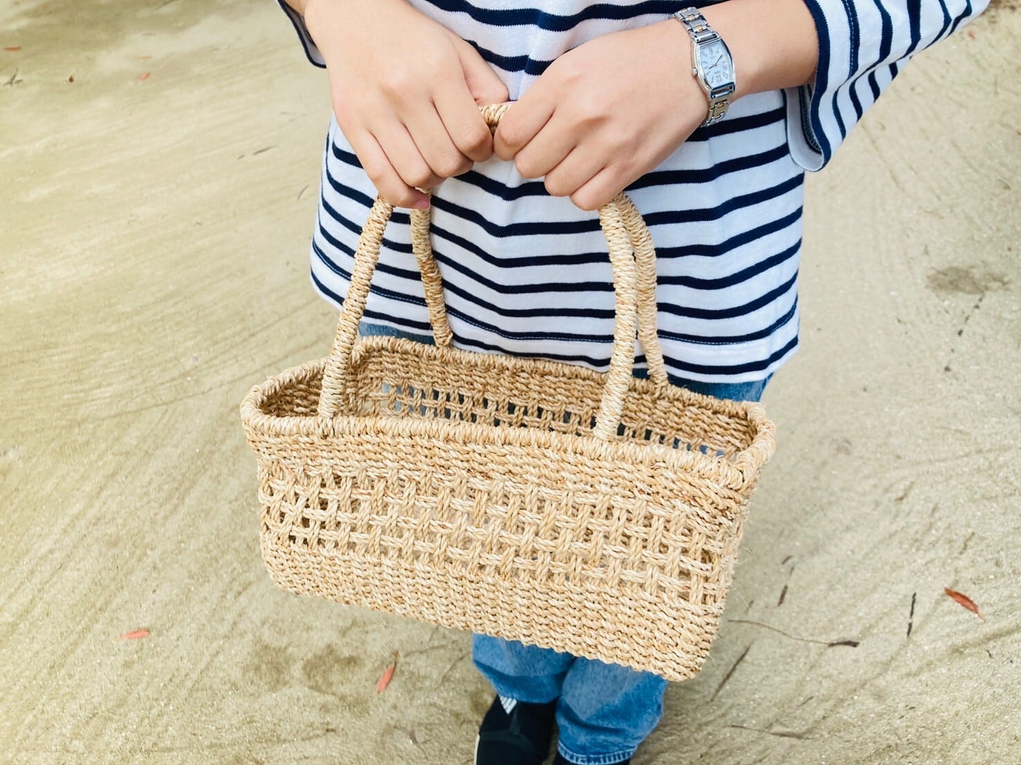 ・材料の月桃を一本一本縄編みし、その際に出た端を裁断しかごを編み上げています。そのため素材自体から小さなささくれが見えたりする場合があります。ほつれてしまう心配は少ないですが、使い始めの当初は衣服や布、アクセサリーなどにひっかけないようご注意ください。こうした裁断処理の部分やささくれは、使っていくうちに徐々に先が丸くなっていきます。